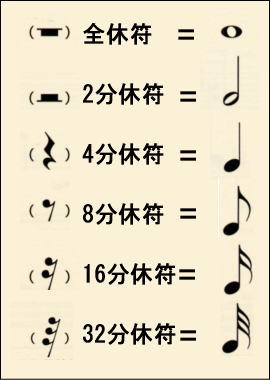 これには下図の様なものがあって、それぞれ=で結ばれた音符と同じ長さ分だけ休むと言うことになります。