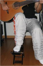 このスタイルで右足に足台を使用している方もたくさん居ます。また、クラシックの構え方と同じように足を組む方法もあります。
